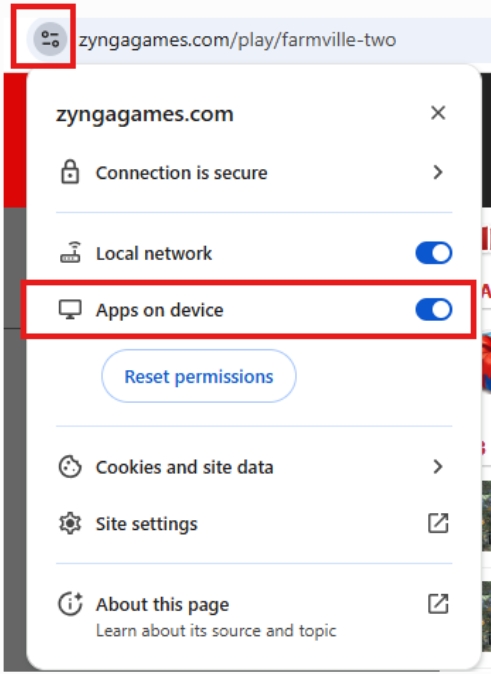 - Falls du den Zugriff versehentlich blockiert oder die Seite geschlossen hast, musst du die Berechtigung manuell über das Symbol „Website-Informationen anzeigen“ erteilen, indem du die Schaltfläche „Apps auf Gerät“ aktivierst, wie im folgenden Screenshot gezeigt: