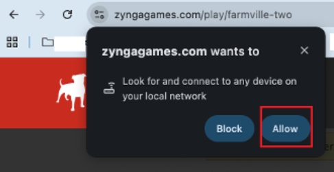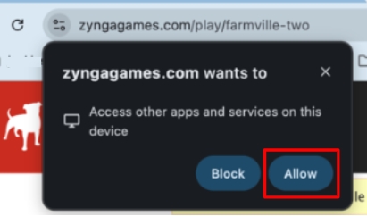 - Wenn du FarmVille 2 auf Zyngagames lädst, wirst du aufgefordert, die Berechtigung für den Zugriff auf andere Apps und Dienste auf deinem Gerät zu erteilen.