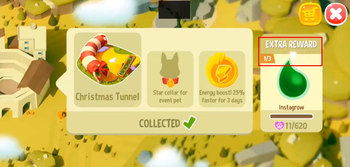 Hol dir coole Belohnungen wie die interaktive Weihnachtstunnel-Dekoration für dein Haustier, einen Energie-Schub , mit dem sich die Energie 3 Tage lang 25 % schneller aufladen lässt, und ein schickes Star-Halsband, wenn du alle Haustiershows abgeschlossen hast. Du kannst auch bis zu dreimal zusätzliche Belohnungen als Bonus bekommen, wenn du dich weiter um dein Haustier kümmerst und die Haustiershow-Leiste auffüllst.