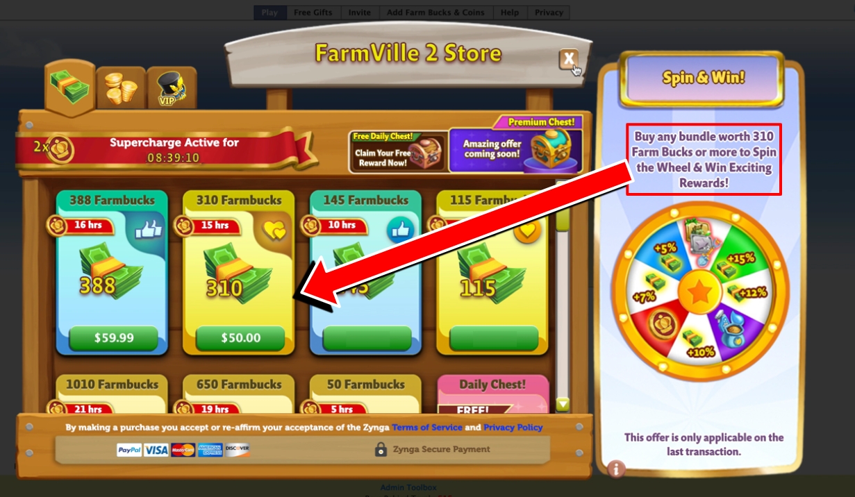 Are you ready for FarmVille 2’s grandest offer? When you buy Farmbucks on Zyngagames.com, you will be able to play Spin & Win, where you can win awesome rewards!