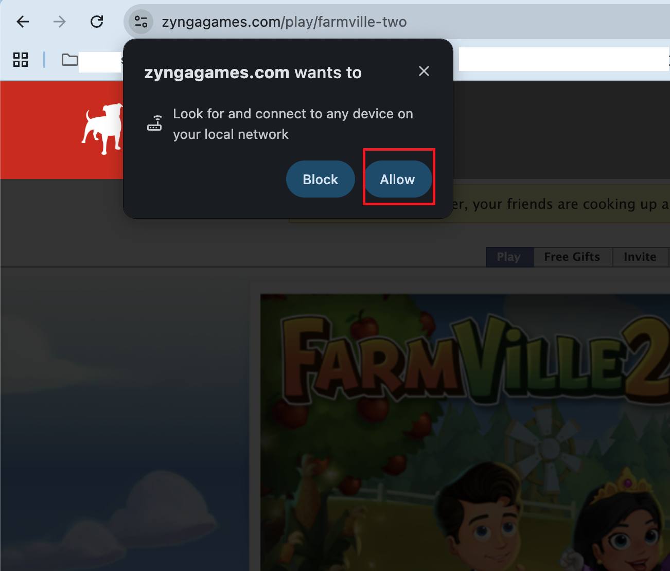 - When you load Farmville 2 on Zyngagames, a prompt will appear asking you to grant permission to access your Local Network.