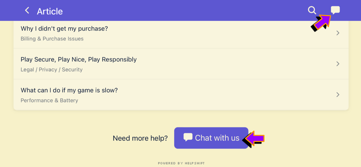Tap on the chat bubble button in the top-right corner of the screen. Or you can also use the Chat with us button when you scroll down to the bottom of the page.