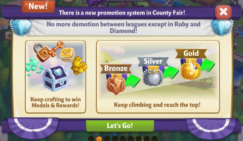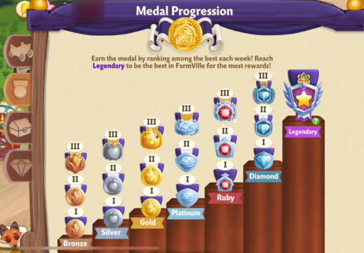 The County Fair Medal serves as a rank for each player. All players start at the Bronze I level, and will have to place on the top 3 spots of their respective leaderboards at the end of the week to go up the ranks.