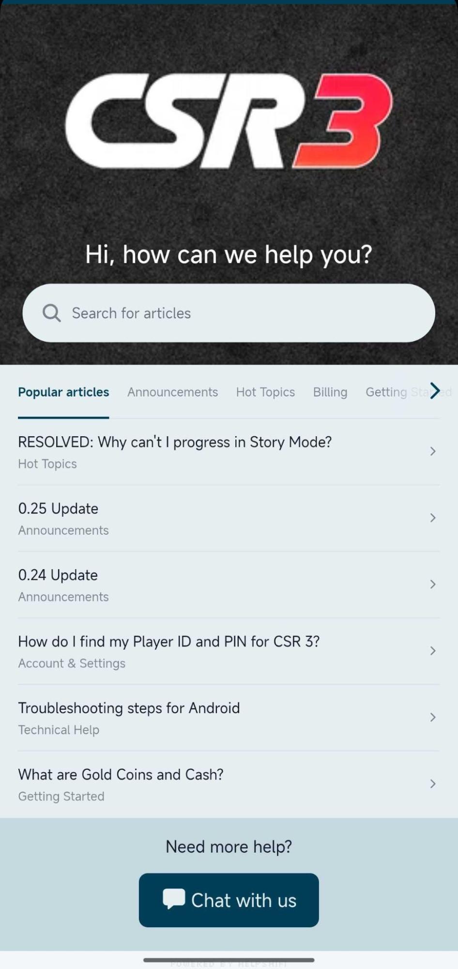 On the pop-up screen, you can search for articles relevant to your query or tap the speech bubble in the top-right corner to initiate a chat with one of our support agents.