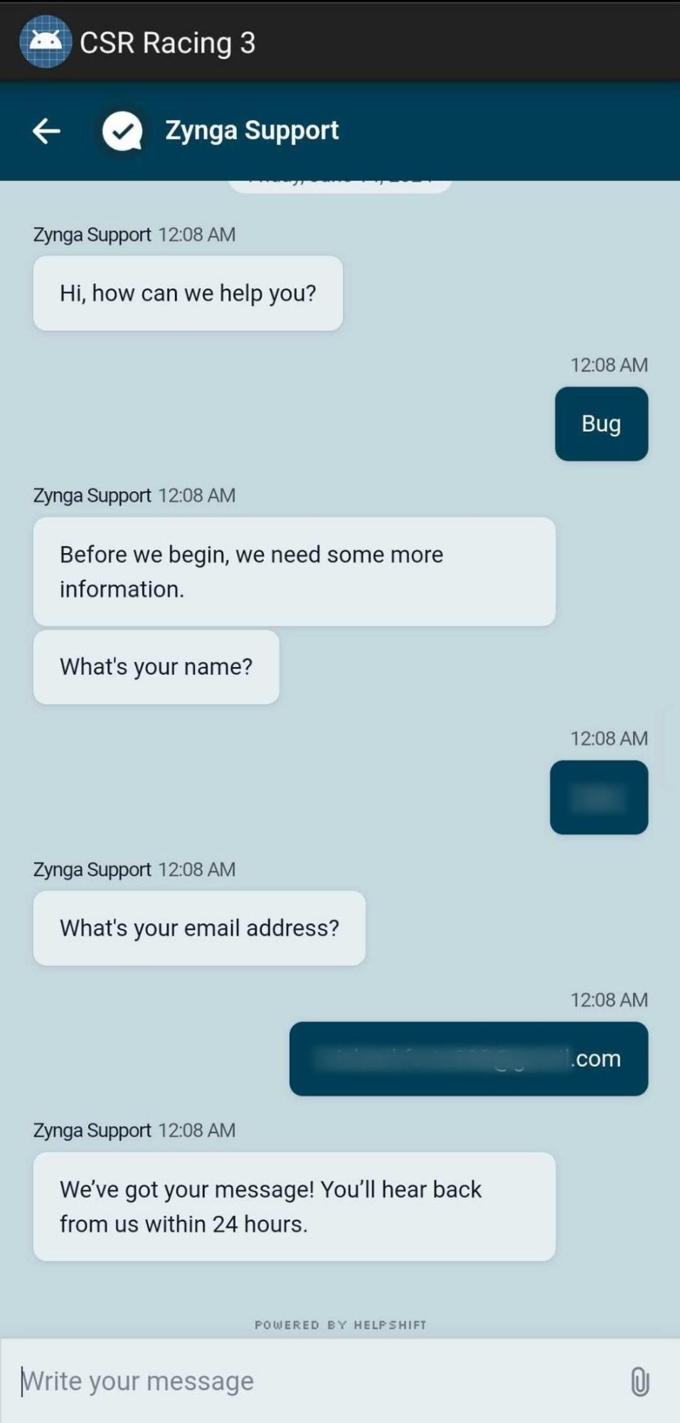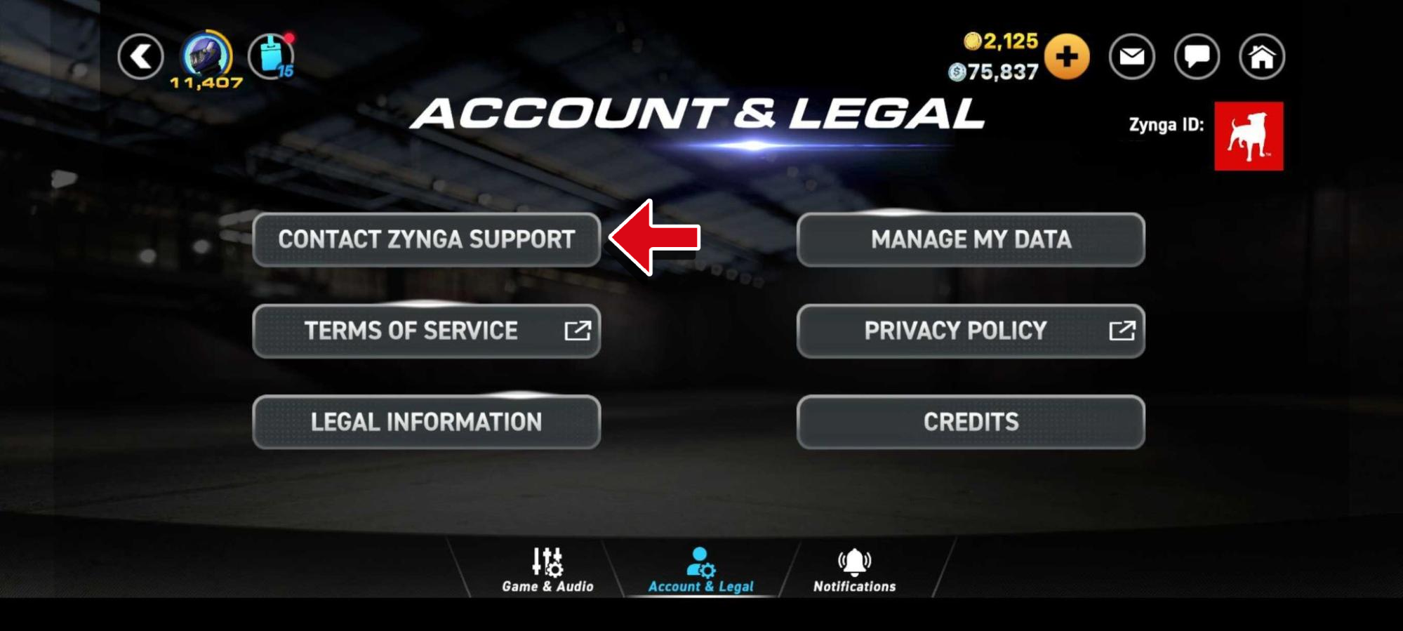 Tap the middle tab at the bottom of the settings menu to open Account & Legal, then tap on Contact Zynga Support.