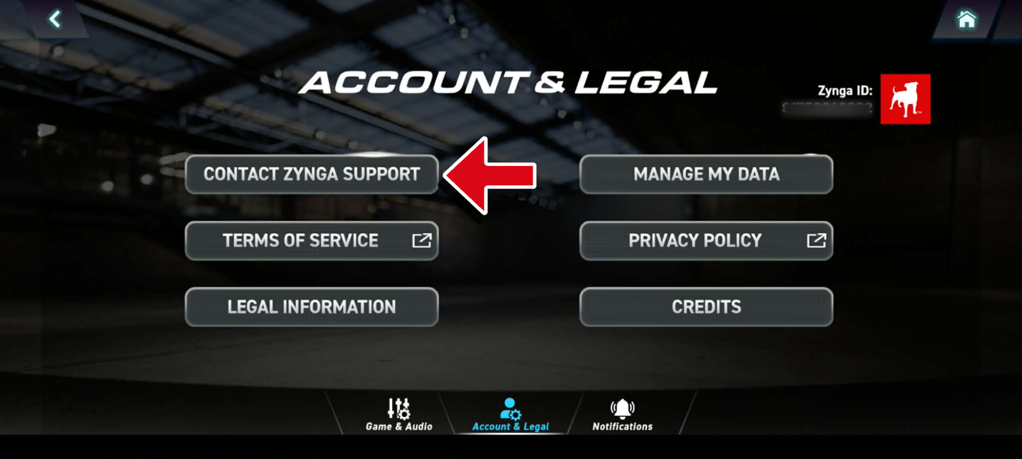 Tap the middle tab at the bottom of the settings menu to open Account & Legal, then tap on Contact Zynga Support.
