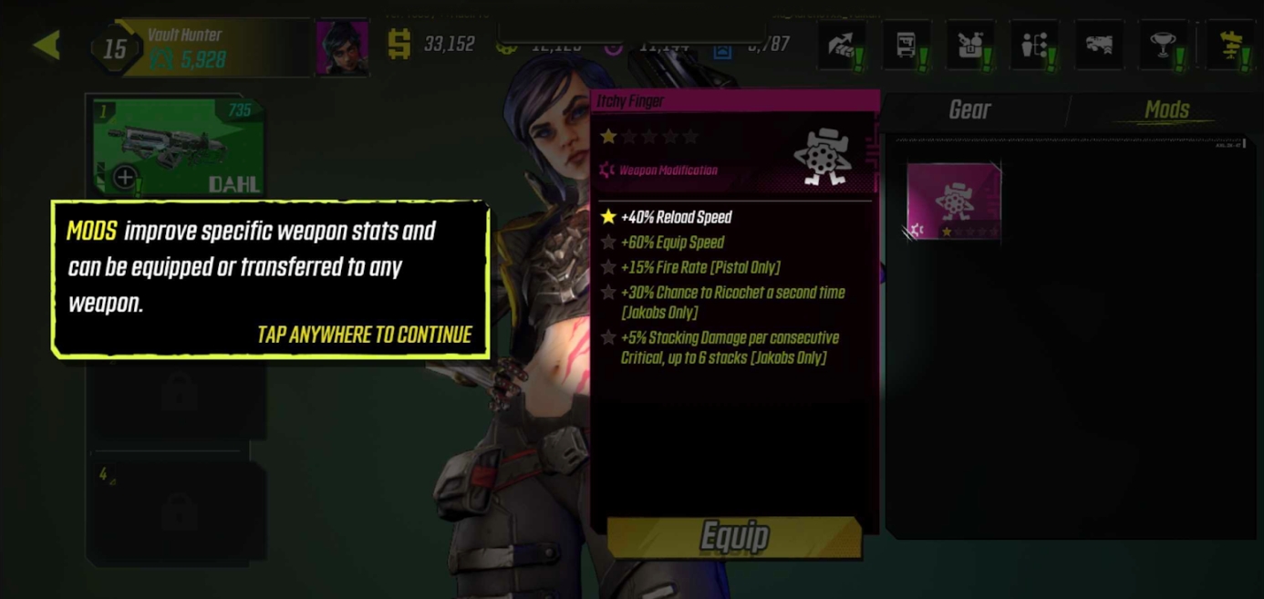 Mods can be equipped/unequipped within the Inventory at any time. There are many kinds of Mods with different stats, so be sure to always be on the lookout for it!