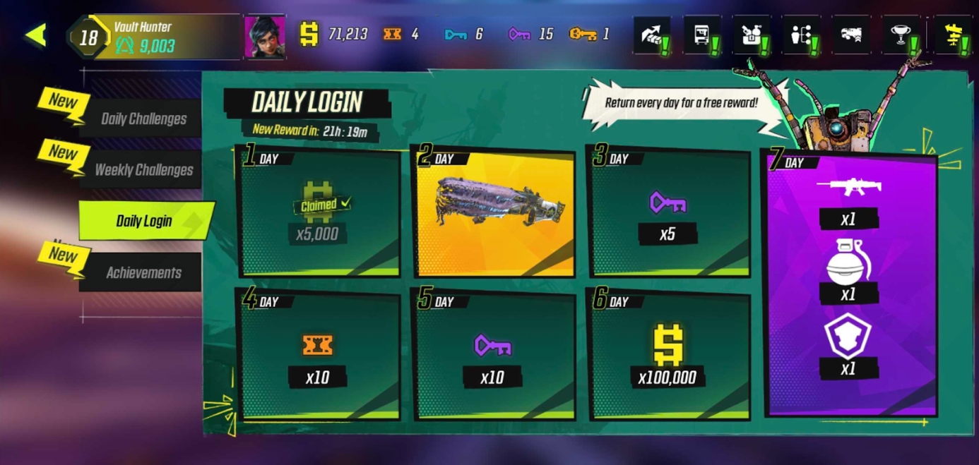 Log in daily to claim amazing rewards from our Daily Login including Weapons, Grenades, Shields, Keys and much more!