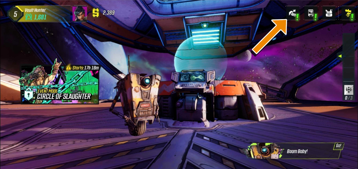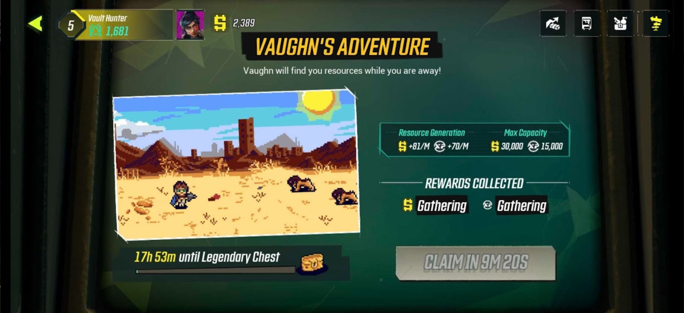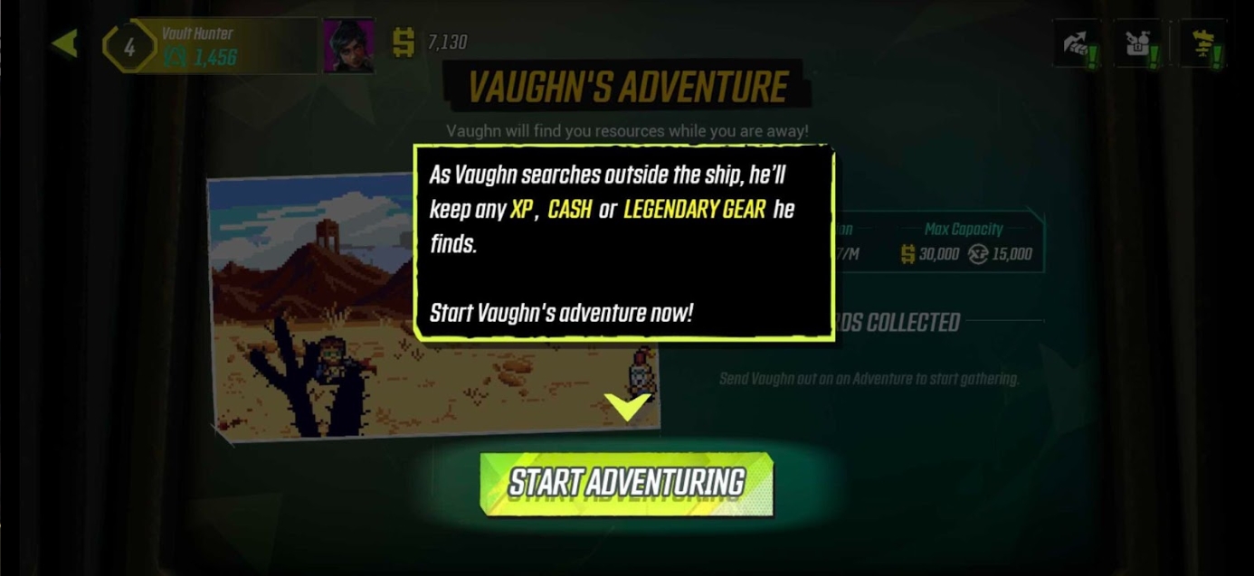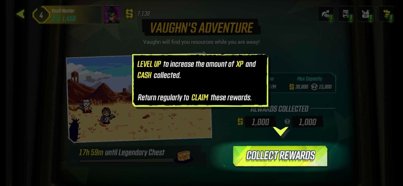 Vaugh will offer you his support by venturing outside the ship to look for extra XP, Cash, and Legendary Chest. You can check back regularly every 10 minutes, and the timer will reset once you have collected the rewards.