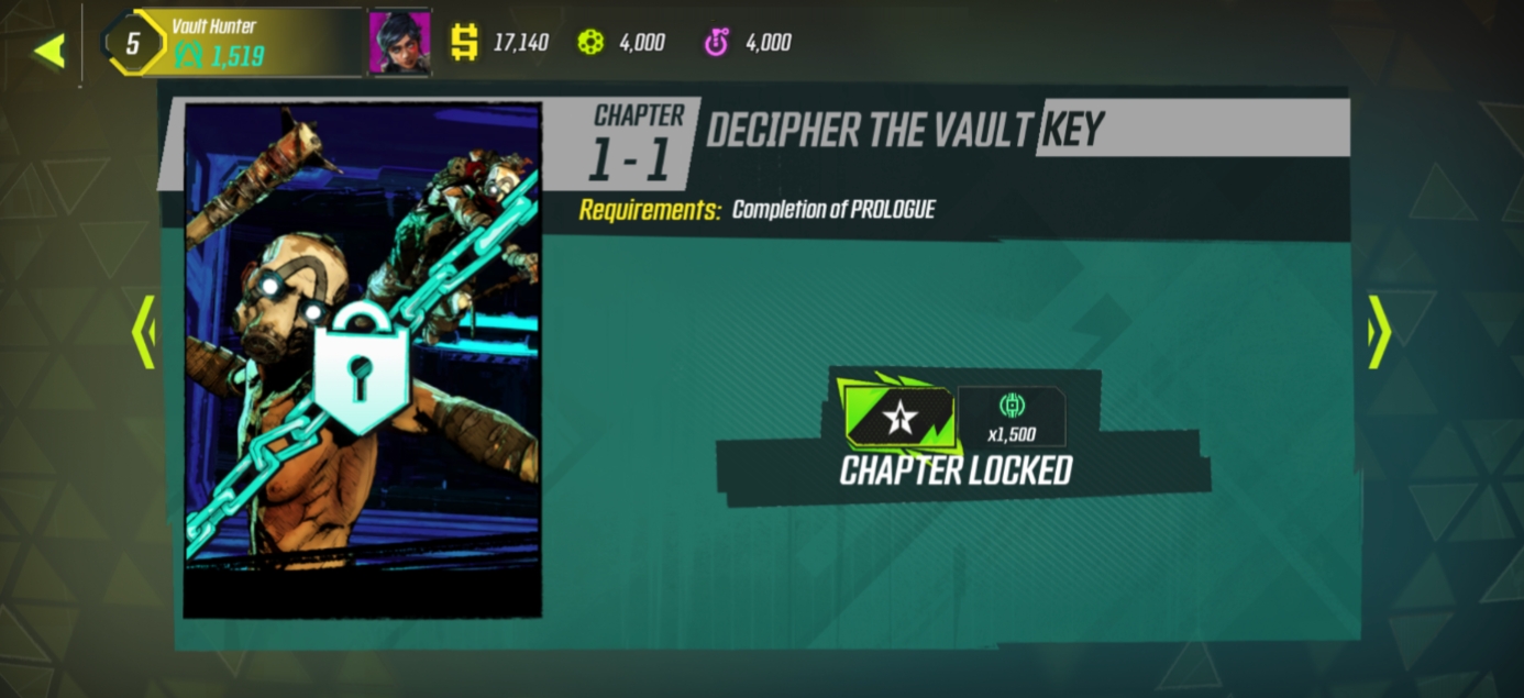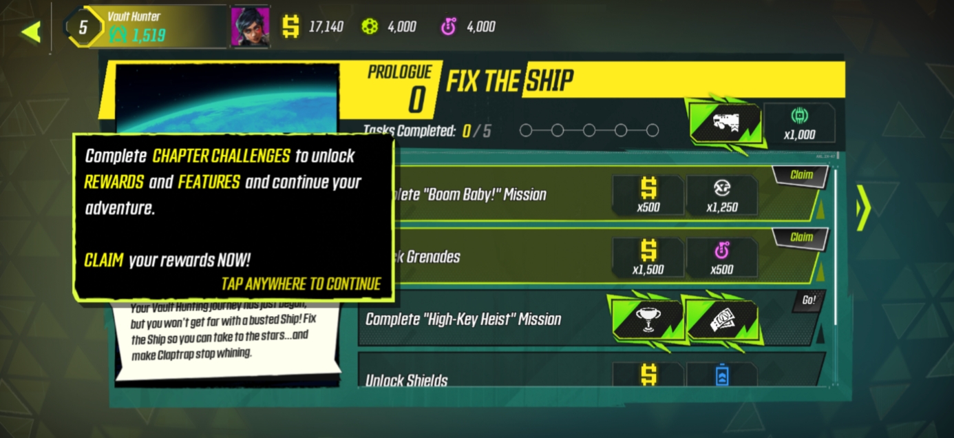 You can earn rewards, achievements, unlock new features and progress in Borderlands Mobile by completing Chapters.