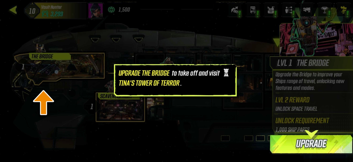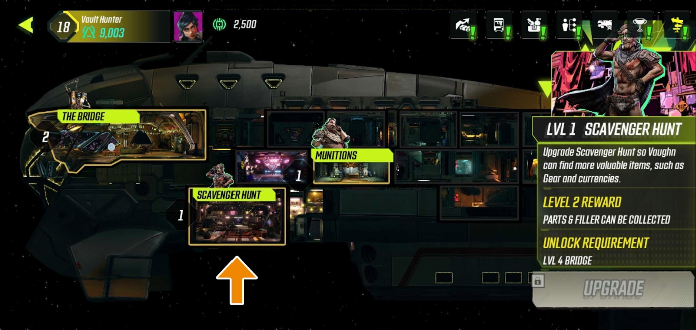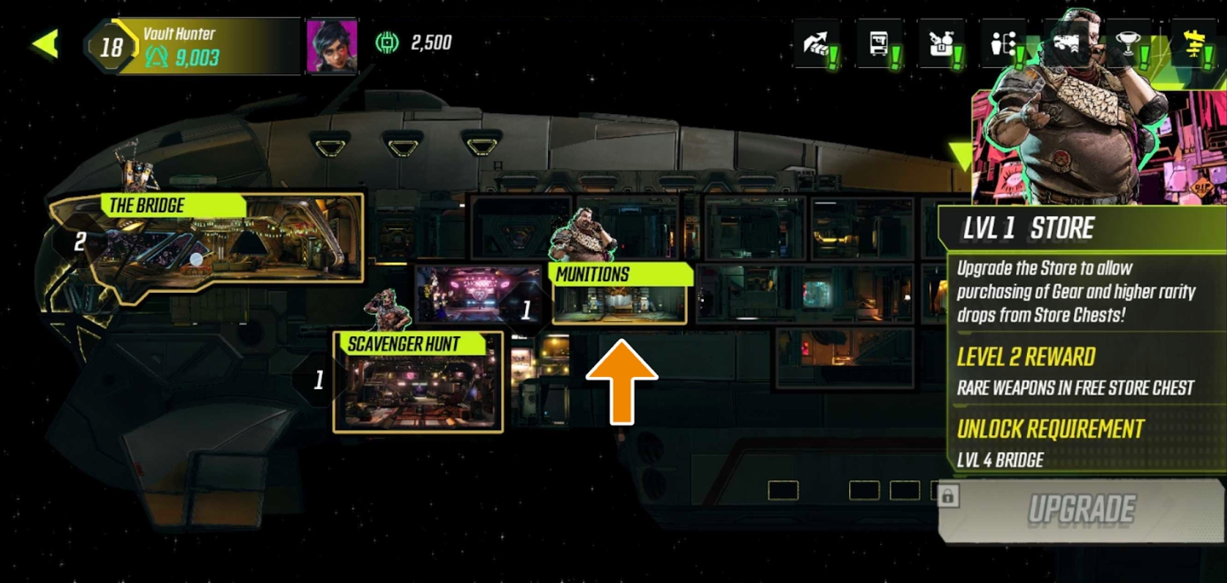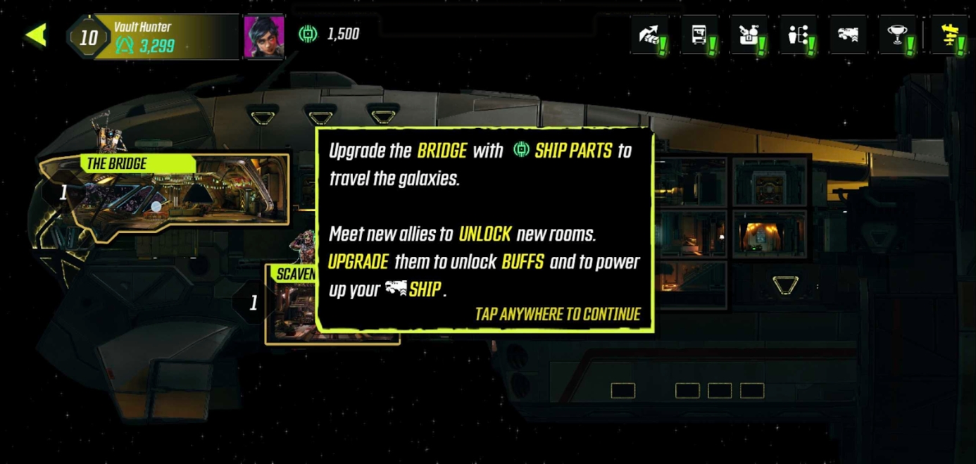Upgrade your Ship using the Ship Parts that you have collected to meet new allies to unlock new rooms. Upgrade those rooms to get Buffs and to power up your Ship in Borderlands Mobile.