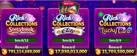 Rich! Collections are new collectible card items that will be available to your game for a limited time. Find all card items to complete the collection and win HUGE rewards and trophies.