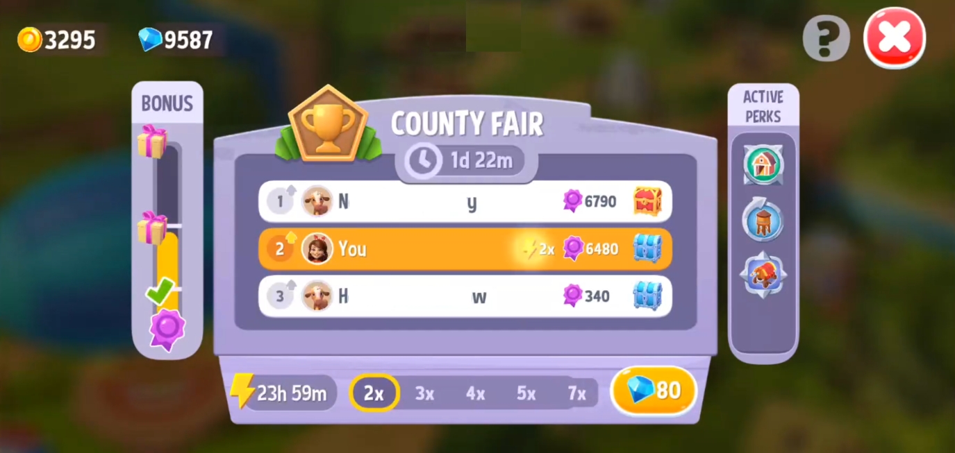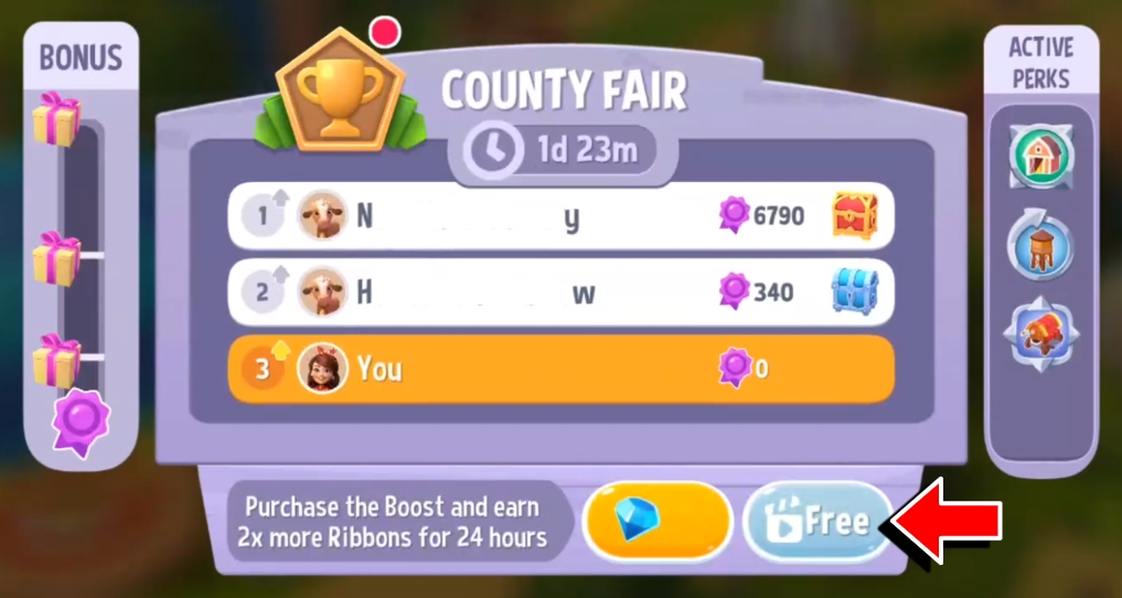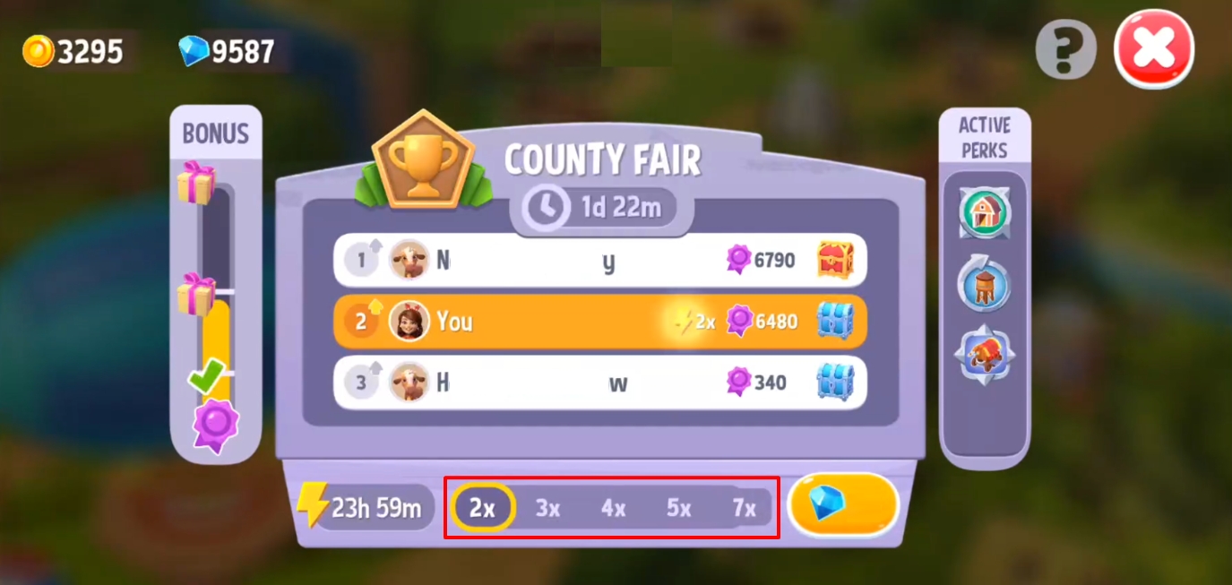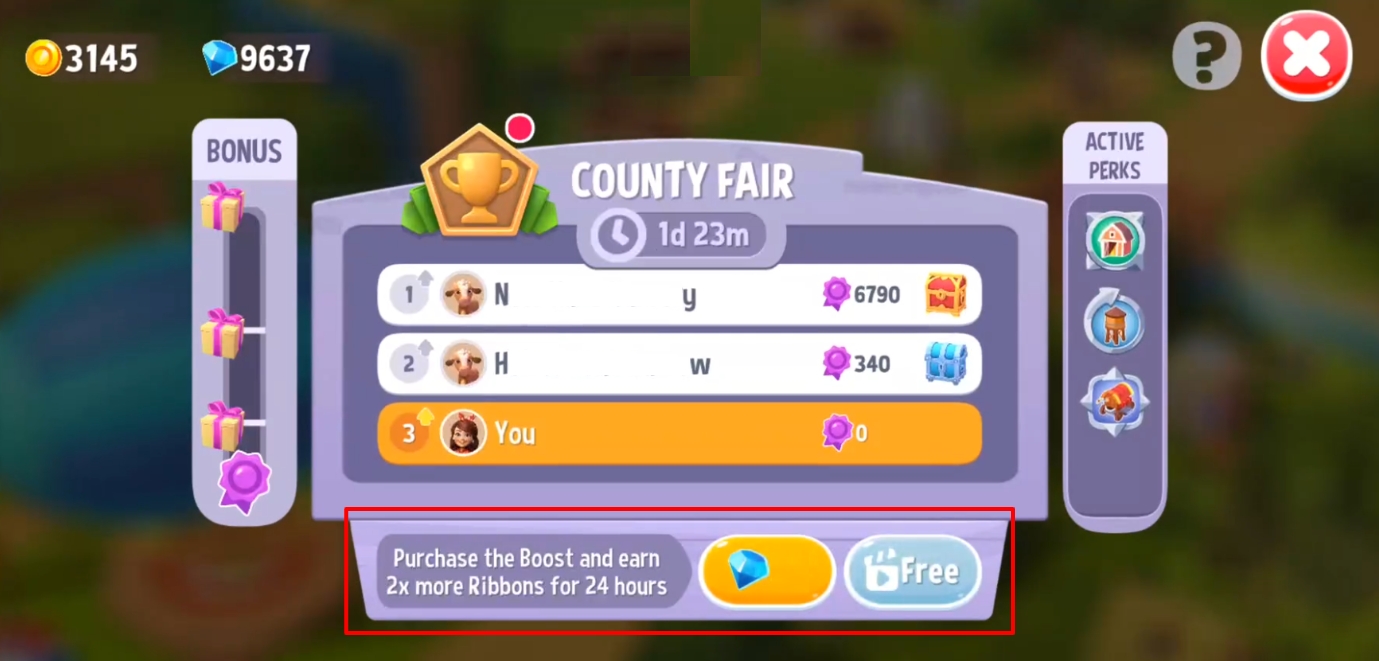 You can use Coins and Gems to activate a limited-time Boost that will multiply your County Fair points. The price of boosts increases with each boost upgrade.