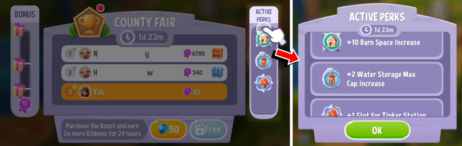 Compete with your County Fair competitors in an exciting one versus one duels! Collect more ribbons than your opponent by the end of each duel to win more rewards.