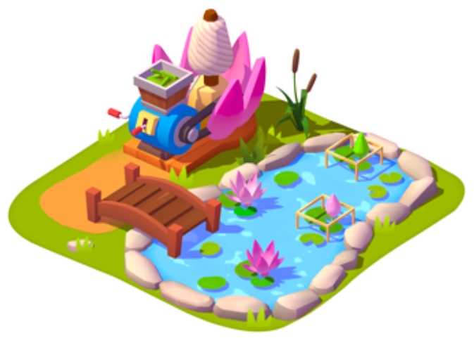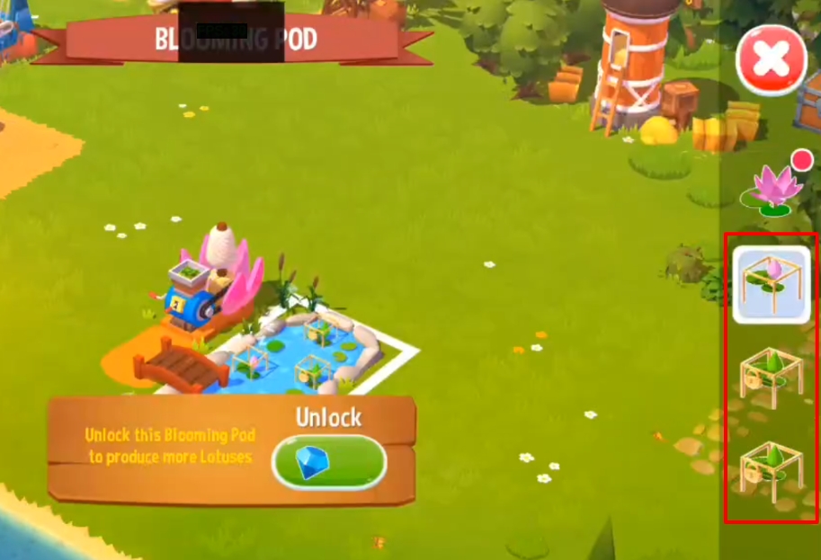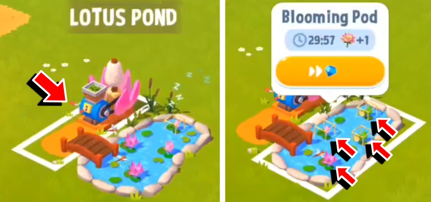 The Lotus Pond is where you can craft items. The Blooming Pod is where you can harvest Lotus Blooms, and you can have up to 4 Blooming Pods. Unlock more Blooming Pods using Gems to generate more Lotus Blooms.