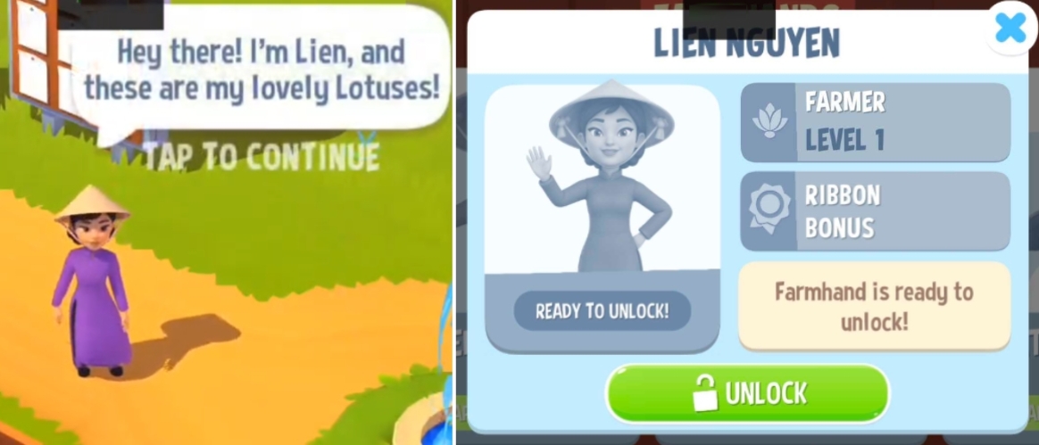 Unlock Lien Nguyen by tapping the farmhand button in the upper-right corner of the screen, just below the menu button. Then, tap again on the farmhand button on the left side of the pop-up screen.