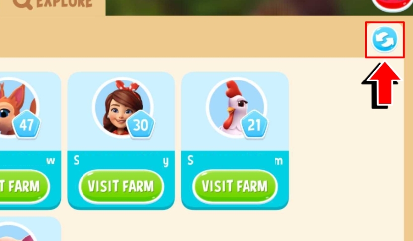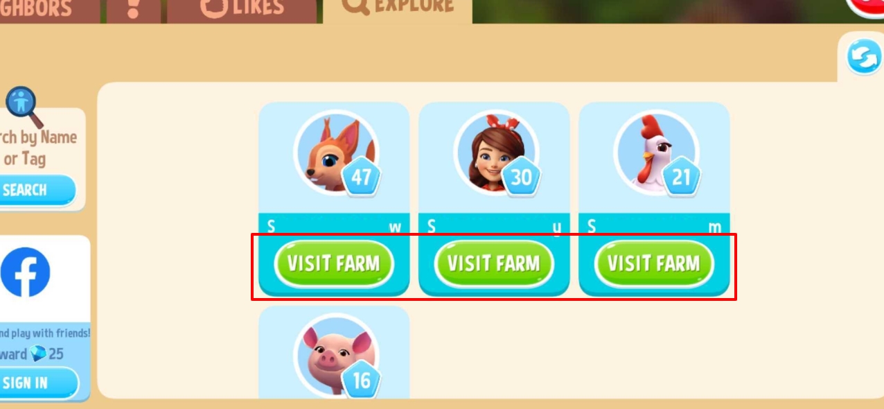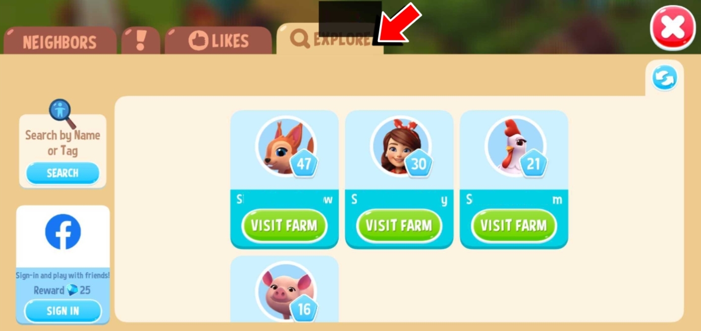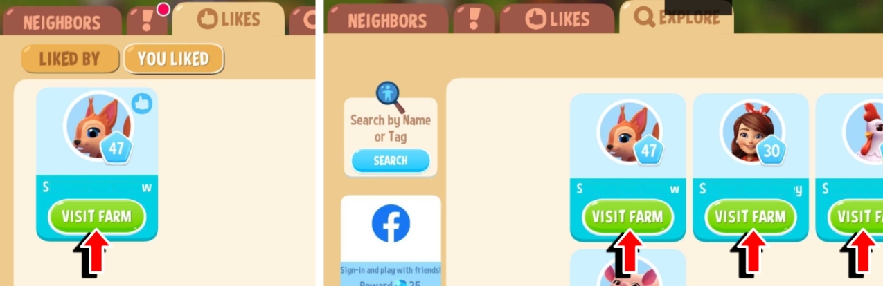 Puedes visitar las granjas de otros granjeros desde la pestaña Me gusta o la pestaña Explorar.