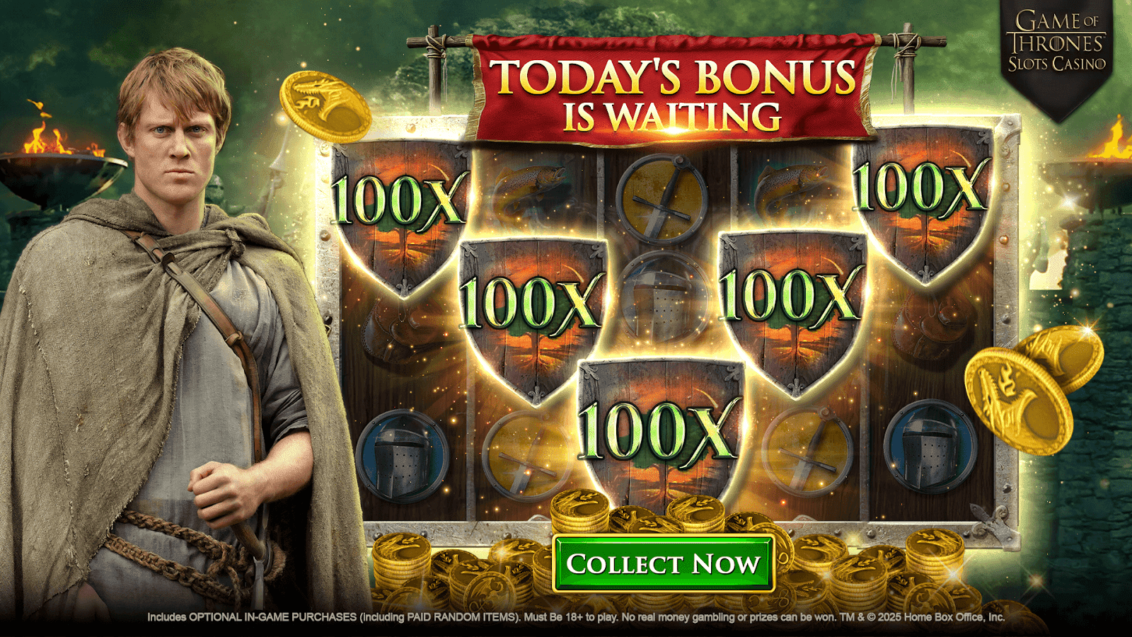 NO PURCHASE NECESSARY; ALL ENTRIES HAVE AN EQUAL CHANCE OF WINNING. Open only to US and CA (excl. Quebec) residents 18+. Must have an active Game of Thrones Slots account. Maximum of 14 entries per player. 10 AM CST 01/18/2026 – 02/01/2026 10 AM CST. Subject to Official Rules at https://zynga.support/GOTSHedgeKnightOfficialTerms - See for odds, prize details, methods of entry, and restrictions. Void where prohibited. Sponsor: Zynga.
