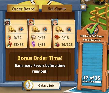 Desideriamo informare i nostri giocatori che i 100 Favor Points e le Monete bonus vengono aggiunte se raccolte subito dopo aver completato 15 ordini, indipendentemente dal tempo o dai giorni rimanenti sul pannello degli ordini.
