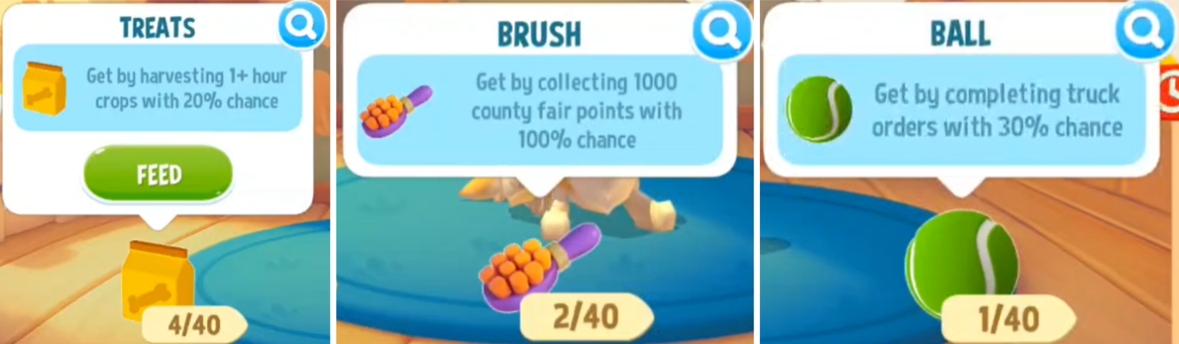 Continua a lavorare nella tua fattoria per rifornire la tua scorta di oggetti per animali domestici. Puoi ottenere: