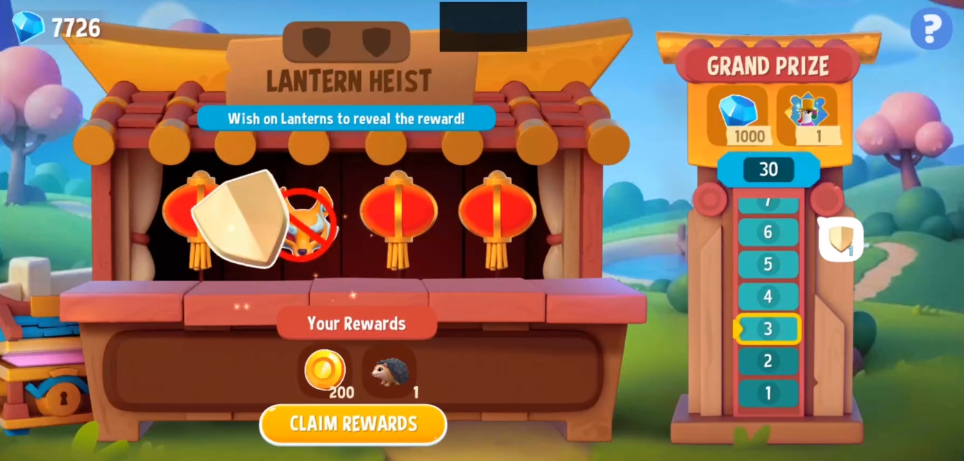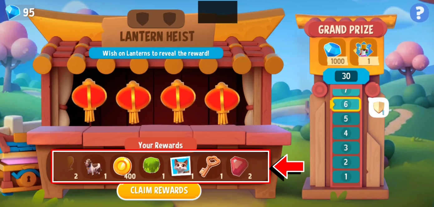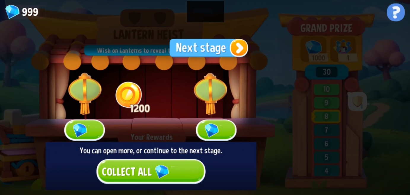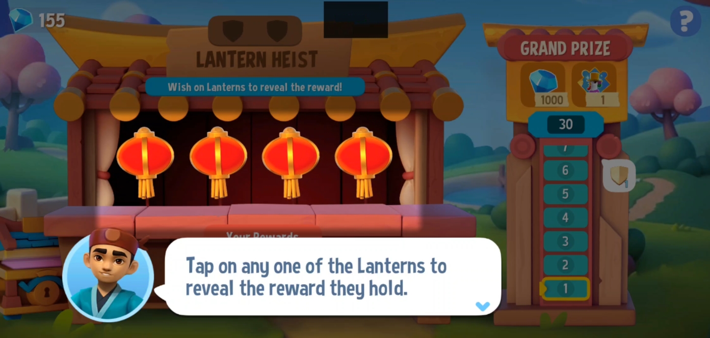 Each stage in Lantern Heist will present you with four Wish Lanterns🏮🏮🏮🏮. Tap on one of them to reveal a prize.