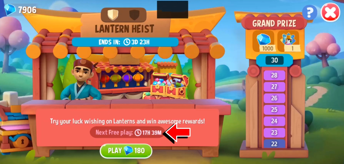 You can play Lantern Heist for free once per day. After one free playthrough, a timer will be shown in the Lantern Heist screen until the next “Free Play” button becomes available again. You also have the option to use Gems to start another session.